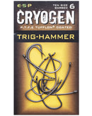 ESP Cryogen Trig-Hammer, A new long shank pattern that has proved outstanding during field testing. Ultra-sharp, long fine needle points combined with an aggressive shape that achieves incredibly secure hook holds. Especially affective on Ronnies and also bottom bait rigs where it flips and pricks instantly. Available in barbed and barbless in sizes 4, 5, 6, 7 & 8 and made using the same twin tempering process as the existing Cryogen hooks which results in exceptional strength and point durability. The relative proportions of a long subtly curved shank, 9 in-turned eye, wide gape and long hypodermic like point result in a hook pattern that is incredibly effective. On Ronnie rigs the hook point is in an aggressive poised position making it a very efficient hooker with superb hook holds and it is equally effective on bottom bait rigs, where the hook is very difficult to eject and turns and catches hold securely even without the aid of a line aligner or kicker.