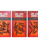 ESP Standard Uni link Swivel, ESP Standard Uni Link Swivels provide a universal hinge and 360 degree movement to otherwise rigid hook links and are ideal for stiff mono rigs and Combi Rigs in coated braid. They also improve the presentation of lighter, more flexible mono and soft braided hook links, effectively reducing tangles on the cast. Packets of 10. Available in sizes 9, 10 and 11 to fit all popular safety clips and in line leads.