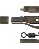 Brand new patented design Tubing Lead Clip that grips and holds tubing inside the lead clip, ensuring it does not slide up the line like it can do with other clips. When using tubing to pin down mainline or to protect the flanks of fish its essential that the tubing does not travel up the line during the fight otherwise your mainline could lift scales causing damage to the fish. The Tubing Lead Clip ensures the tubing can’t slide up the line. It features a side window that allows access inside to thread on a locking funnel (witches hat) to the mainline that’s pushed into the tubing. When this window is replaced the peg feature locks the swivel and the tubing in place preventing the tubing from slipping loose out of the clip. The precise fitting tail rubber allows the lead to pull off the clip in the event of it becoming snagged but unlike with other clips the tubing will not get dragged up with it.