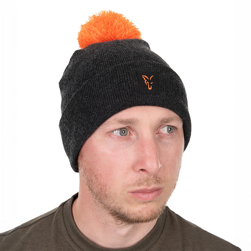 The Fox Collection Bobble Hat Black/Orange, an all black design with contrasting orange bobbles and fox detailing.