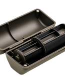 The ChodSafe is the perfect storage system for any angler who uses chod rigs and allows them to be kept in perfect condition until you need them. It is built from rugged plastic and finished in soft-touch rubber, with a flip-open lid that is held closed by magnets when not being used, to prevent any chance of spillages. Inside there are two different foam-covered cylindrical, removable, sections for storing your chods, with the differing diameter of them allowing you to keep the perfect curve to both your short and long rigs. Hooks are held in place via a machined, grooved, aluminium bar, which also avoids any chance of damage to the points during transit, and the other end of the rig is secured to the foam via a pin – 30 pins are supplied with each ChodSafe. As well as being able to hold 28 pre-tied chod rigs, there is also space for three leadcore leaders complete with Heli-Safe Systems. When the cylinder is lifter out of the case, you can pop out a recess handle, which has been designed to help you to steam the perfect curve into your rigs without burning your fingers.