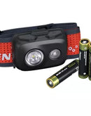 Convenient dual switches (one for each beam) allow for quickly switching between four brightness levels in white light mode and two red light functions (continuous and SOS mode). The lighting angle can be adjusted vertically up to 60°, and the headlamp contains built in electronic lockout functionality to avoid accidental activation, overheat protection, plus an intelligent memory circuit to memorise the last selected white light mode.