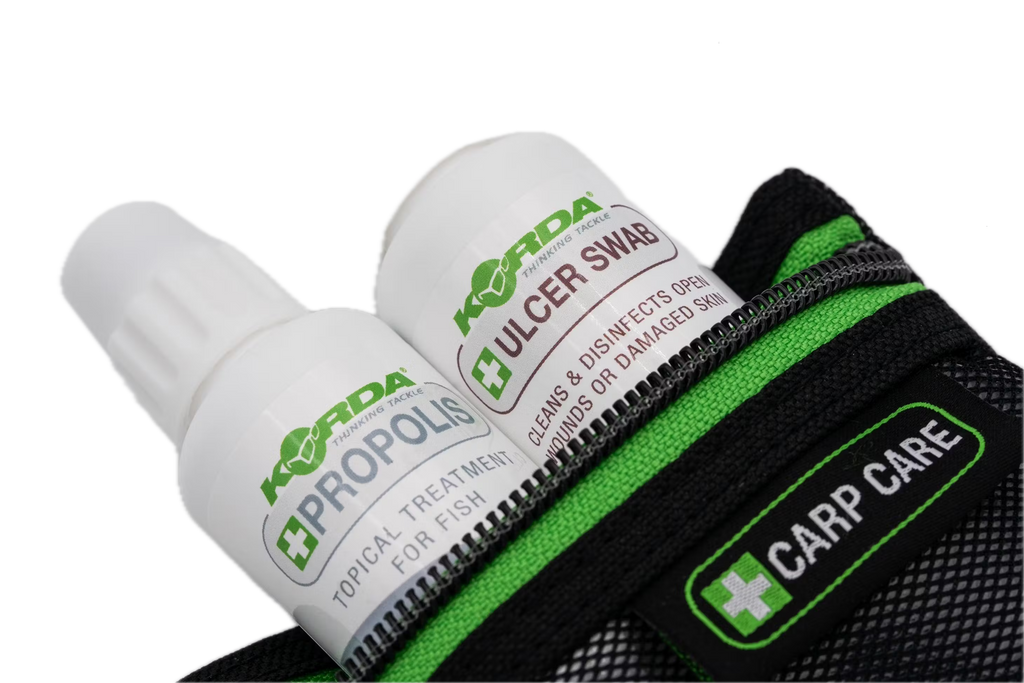 As anglers we want to return any fish that we catch in the best condition possible, and the Carp Care Kit certainly helps to achieve that. It comes in a zipped pouch and includes 30ml each of Propolis and Ulcer Swab.