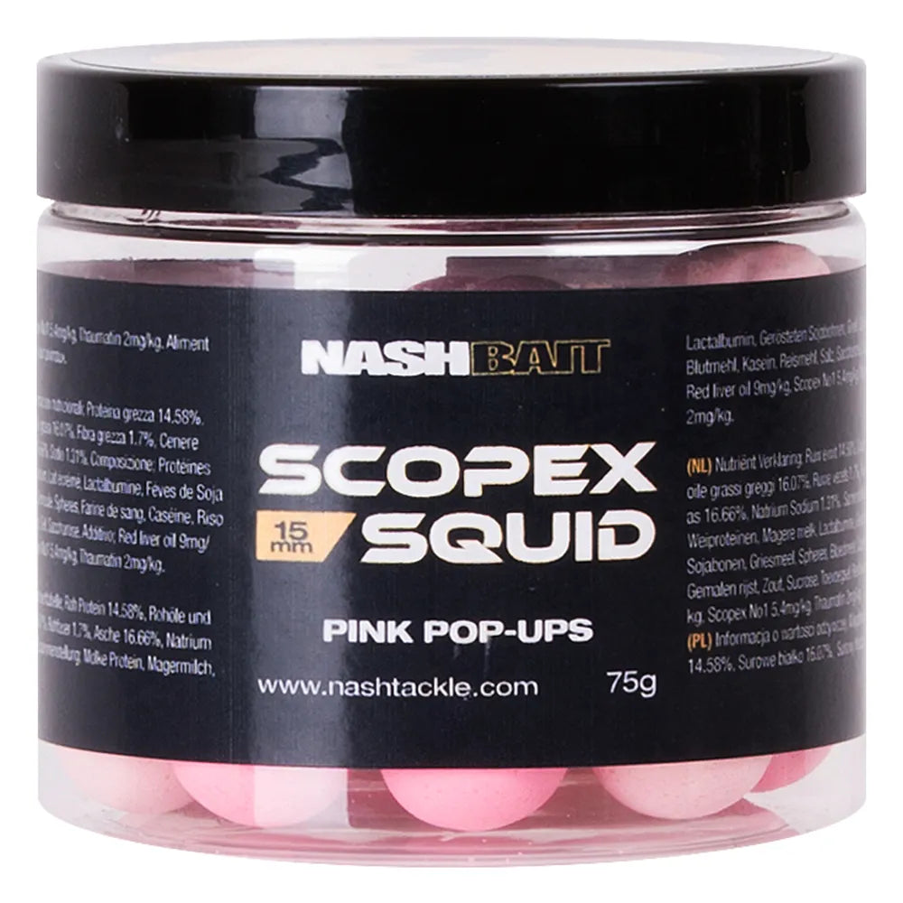 Nash Scopex Squid Airball Pop Ups, Improved buoyancy, needle friendly Nash Airballs to match the deadly Scopex Squid boilies. Using the same dedicated liquid blend as the frozen and shelf-life Scopex Squid boilies, carefully co...
