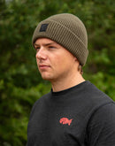 The Fox Olive Merino Blend Beanie, manufactured from warm and luxurious Merino wool blend.
