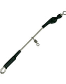 Portuguese rigs are deadly, the concept of fishing with three hooks below the weight is alien in shore fishing, and one most people will think ends up in tangles! Our URFE has been designed to construct these easy to tie, often underrated rigs. The inbuilt rig clip is hidden by a piece of tubing, slotting the lead-in here and then moving the tubing over to secure, fixes the lead in place. To the opposite swivel, the mainline is attached, and to the middle swivel, the rig is connected. The URFE allows for fishing longer rigs with longer snoods, giving the rig more movement, particularly effective when the fishing is slow.