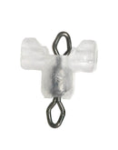 Unlike a traditional three-way swivel, the T Swivel allows complete freedom of movement of the hook snood in all directions. A standard swivel slots into the plastic housing allowing you to attach the hook snood with full rotation, while the plastic body allows the whole unit to freely move around the rig body line. This eliminates line twist. Furthermore, the plastic body acts as a mini boom, allowing the hook snood to stand off the rig body to reduce tangles. This is a good swivel to use on flapper rigs and can be crimped in place with no knots required.